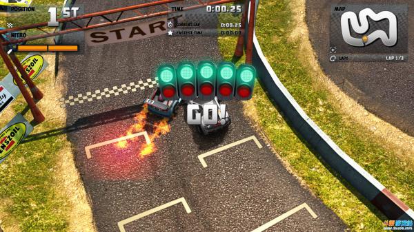 本作画面整体表现还是不错的,游戏中的赛车感觉就是玩具赛车,但是赛车虽小,赛车的细节方面还是刻画得比较细致的;赛车赛道的感觉制作比较粗糙,地面纹理方面不是很清晰;作为一款赛车游戏,赛车在高速行进的过程中所体现的动态模糊效果不是很好,场景在切换时,一些细节不是处理得很好。