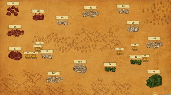 右边的是资源框,游戏里共有3种资源:粮食、石头、木材。各种建筑物、兵种的出产都需要不同的资源,每一样都很重要。资源后面有一个“+”号和数字,表示每一回合会增加(如果是减号就是减少)的数量。