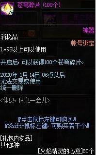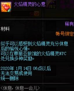 1、DNF火焰精灵的心意是在[休息,休息一会儿]活动中获得的道具,在五种休息方式中选择一种进行休息,根据休息方式的不同可以获得不同数量的火焰精灵的心意;