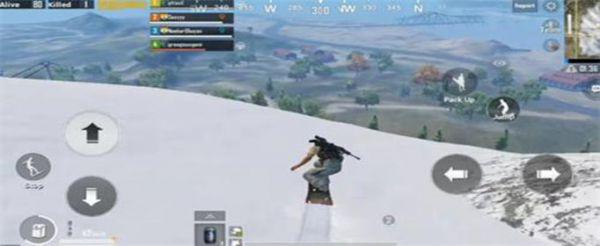 2、小伙伴们在匹配至圣诞地图后,可以前往山顶废墟、G岗、学校宿舍的山上(通过小地图,可以得知上述区域已经被冰雪覆盖)。如此,通过滑板的点击,即可体验滑雪的乐趣;