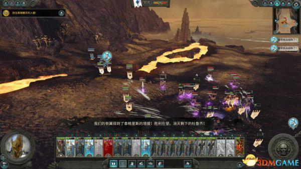 战局忽然逆转,在黑魔法作用下我方士兵陷入苦战。就在战斗胶着时我方援军泰格里斯带着高等精灵魔法师队伍从两侧翼对敌方进行包夹,一时间战局再次逆转。