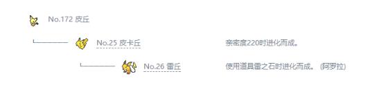 皮丘→皮卡丘(亲密度220时进化而成)→雷丘(使用道具雷之石时进化而成)