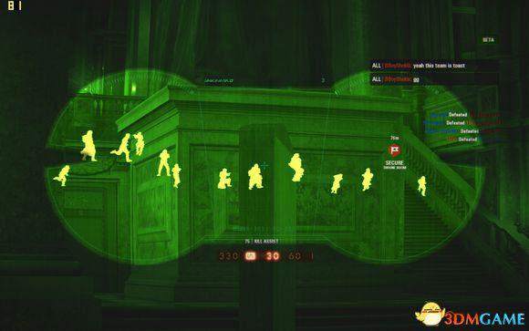 3、下图是兵种specialist(我称之为特种兵)的默认第三技能,可以使用热成像观察到敌人位置,我称之透视望远镜、官方外挂,这是一个非常好用的辅助功能,当你选择了特种兵,在跑路的时候可以顺便看几眼,这个技能能够使你的队友看到障碍物后的敌方人员被红边圈出来,称之为最强辅助技能都不为过,而且你的队友杀死了被显示出来的敌人后,你可以获得25分/人的积分。我有次游戏的时候做攻方,刚开局就来了个电话,我就站在出生点安全的地方,一手打电话,一手按着右键站着不动对着前面左右扫描,电话打完,都已经进入最后一个阶段了,我看了下我的分数,居然都超过5000了。