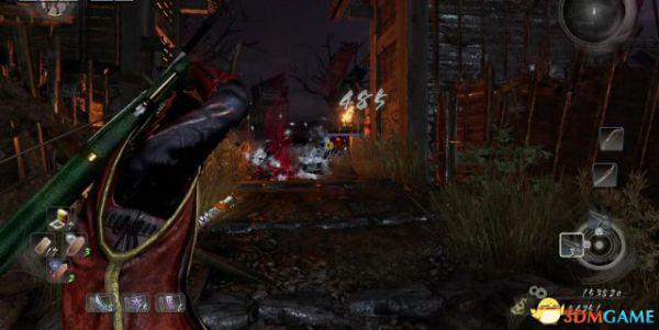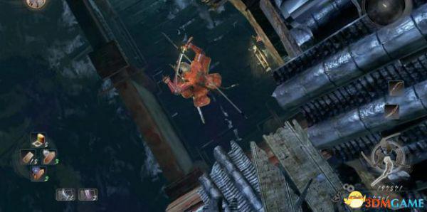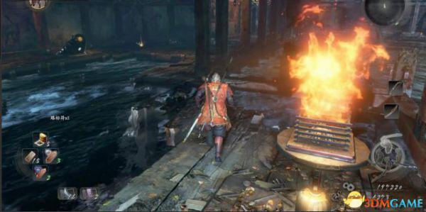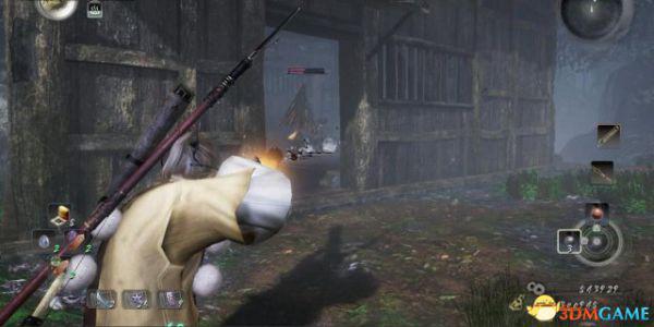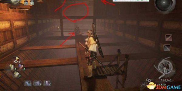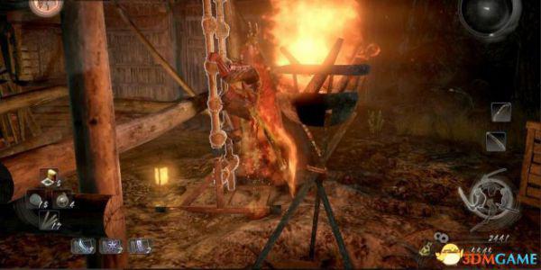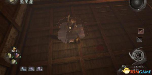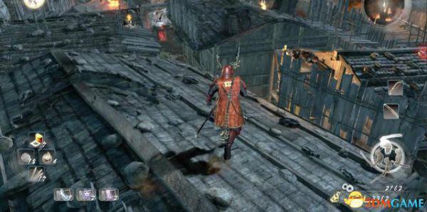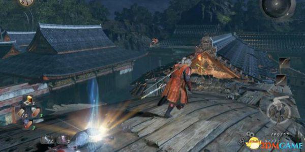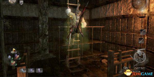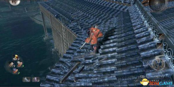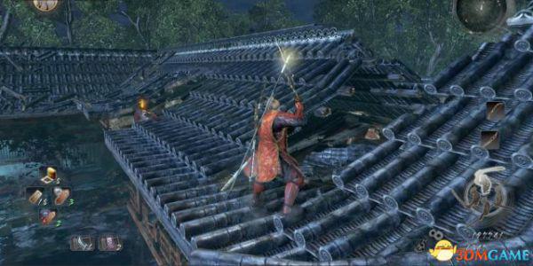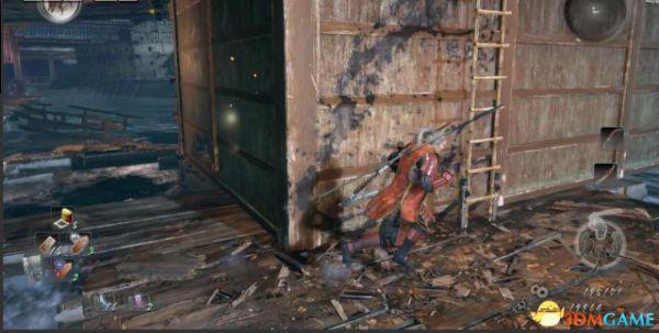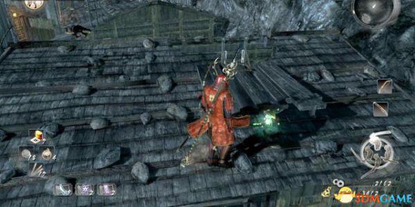 由于房顶比较狭窄不好回避,在这里发动九十九武器一口气干掉鬼。他背后过两个房顶之后能顺着梯子爬下去,或者跳下去也可以。