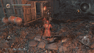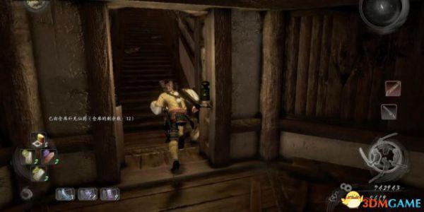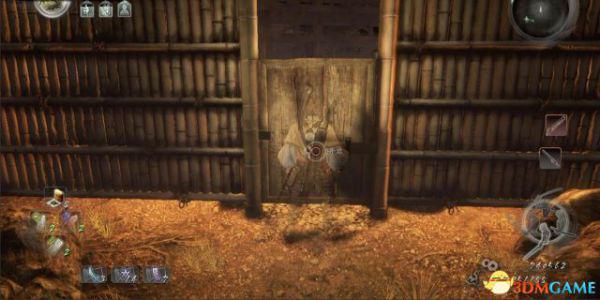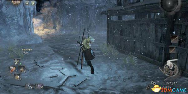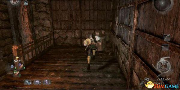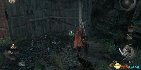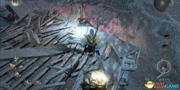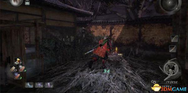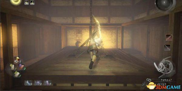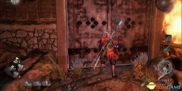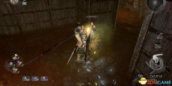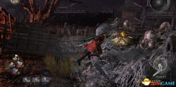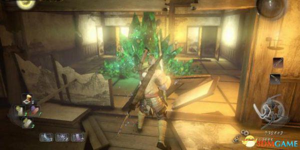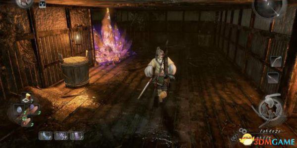 从这边跳下去之后就绕到了房子的左侧,这里可以从后面一个一个勾引房子周围的杂兵打死。在房子内有一团“常世”(即黑灰色的气场),打死这个鬼之后能在他身后的宝箱里拿到钥匙,开启房屋后面的门。
