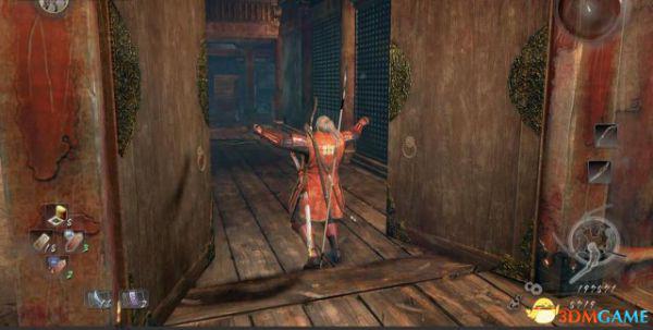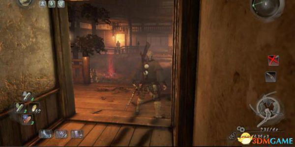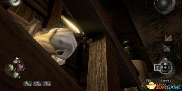 进门从梯子爬上去,出门后右侧有一个埋伏的忍者。这关同样推荐用“透波术”和“猫步术”来隐去身形,除了少部分强制发现你的敌人配置之外,你可以比较轻松地防止偷袭。