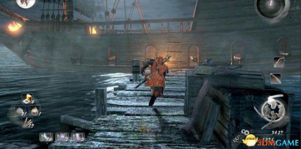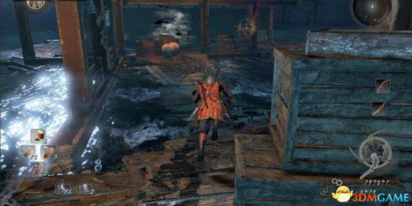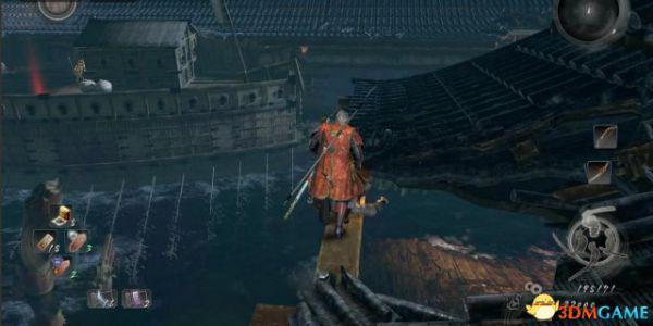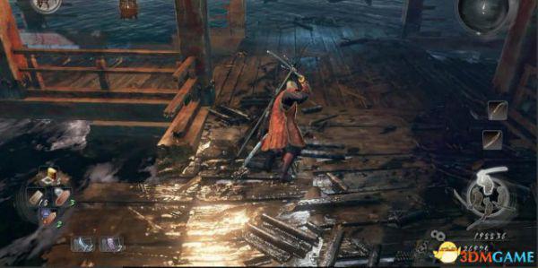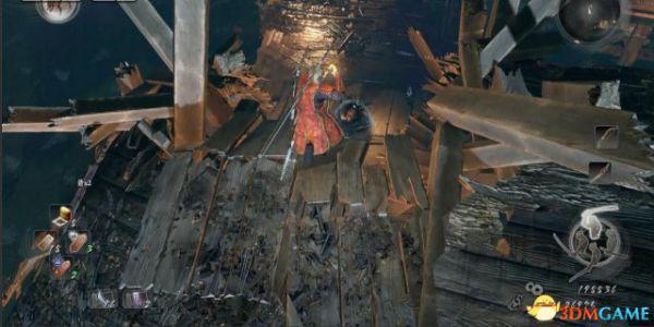 接下来要去的地方就比较有限了。浅滩上的船里就是本关的Boss,浅滩最里侧有一个特别的血刀塚以及若干道具可以捡。有一扇门不能从外面打开,需要从旁边跳到房顶才可以。