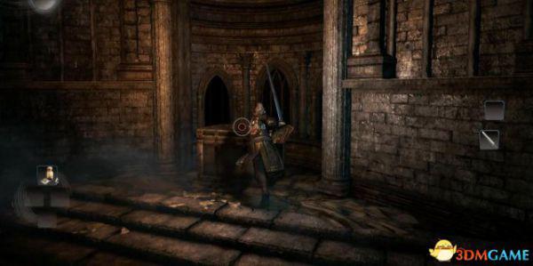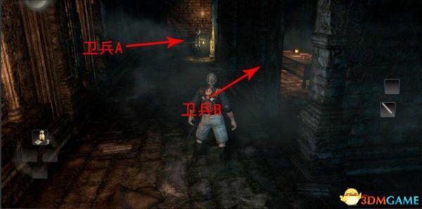 螺旋楼梯走上去之后有两个卫兵,一个近战一个远程,远程的攻击频率很慢,只要保持左右移动就可以避开。如果求保险的话可以站在石柱后面等近战兵过来故意让他发现,就逐个击破。