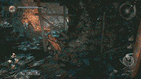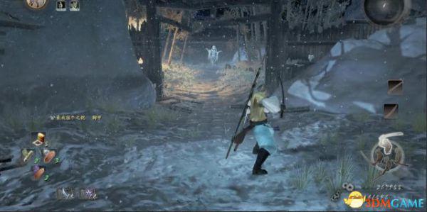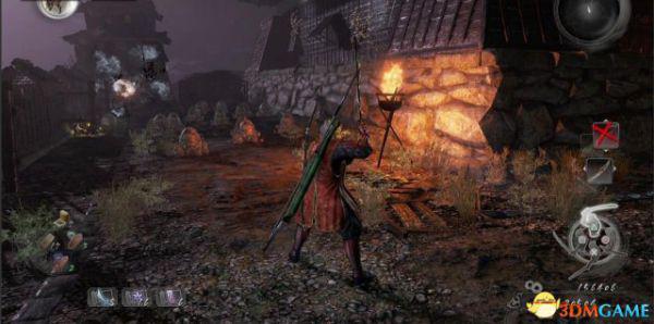 在闪着火光的小屋处可以捡到弓以及箭。此处往右走就是下一个神社,往左走则可以开启捷径。