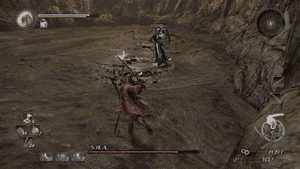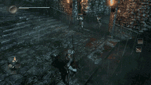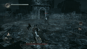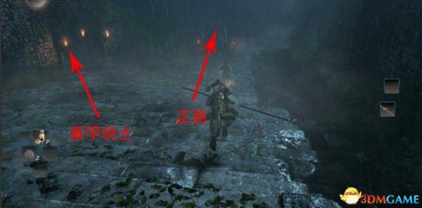 重甲骑士很多时候会两个一起出现,用长枪的□攻击可以同时打到两个敌人,砍完一套闪避。这里注意如果不先引敌人出手的话,他们没有硬直的时候会防御。