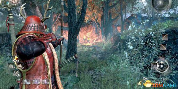 如果我们从前方正路走,会碰到一个巡逻的轻装敌人和一个重装的武士。用弓箭可以射掉轻装的敌人,重装的武士戴着头盔,第一箭并不能射死。