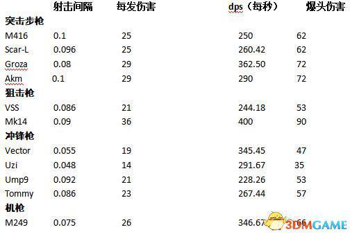 有个错误,M416的射击间隔应该为0.086,所以它的每秒dps为290.7。