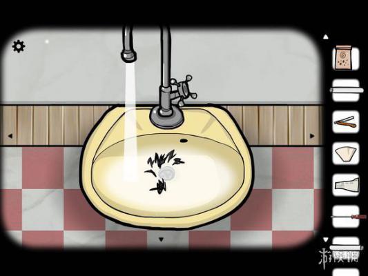 用螺丝刀打开排风管,出现猫,喂它小乌鸦;吃完后切换到别的场景再回来,发现猫走了,留下猫粪和蛋,点击捡起蛋
