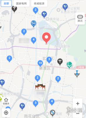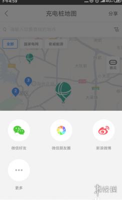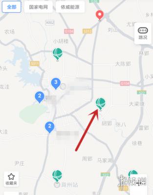 3、打开后会进入我们当前的定位的区域,显示绿色的标志表示充电桩的地点。