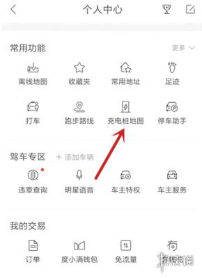 2、进入到百度地图的个人主页后找到常用功能里的【充电桩地图】并点击。