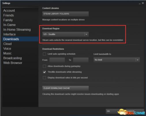 点击左上角Steam-设置-下载,选择一个新的下载地区,然后点击确定。