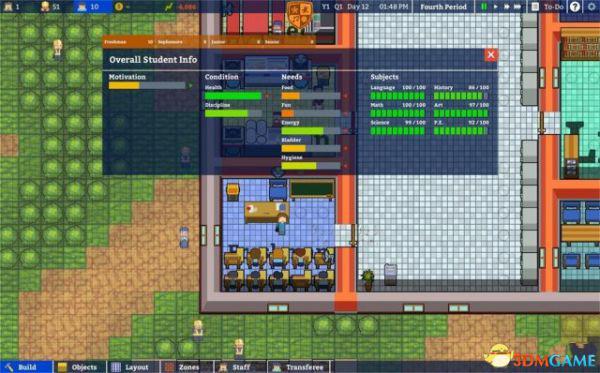 评估系统共分为A~F的6个等级(可点击游戏界面正上方的校徽按钮查看),该系统可分为三个方面——通过率(Passing Rate)、清洁度(Cleanliness)和整体评估(Overall Grade)。其中,通过率由学生们的期末考试成绩来评判。因此,刚开始游戏的时候,玩家的通过率自然就是从最低的F级开始。而清洁度的评判则主要取决于你在开始时建造的校园的外观。通过率和清洁度则是关乎到整体评估的标准。