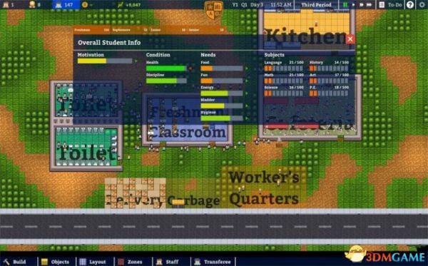 通过左上角的学生数量按钮可以点击查看全体学生信息(Overall Student Info),学生的动机(Motivation)和教师的科目知识水平影响着学生的学习成绩,从面板靠右边的科目栏(Subjects)可以看到他们各科的成绩。而影响着学习动机的又是状况(Condition)和需求(Needs)以及另外一些外在条件。其中学生的状况可分为健康(Health)和纪律(Discipline)两方面,而需求有食物(Food)、娱乐(Fun)、能量(Energy)、膀胱/如厕需求(Bladder)、卫生(Hygiene)这五方面。这其中的利害关系笔者会在七楼的评估中细谈。