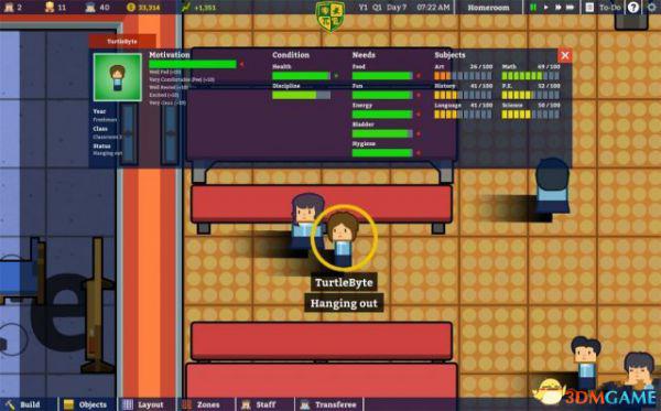 点选地图上的学生,可以查看他们每个人的详细信息。其实就比上面的全体学生信息(Overall Student Info)多了五项:角色形象、年级(Year)、班级(Class)、状态(Status)和动机(Motivation)下面的原因。比如图中这个叫做TurtleByte的哥们,一年级二班(Freshman Classroom2),明明只有一个科目及格却还在闲逛(Hanging out)。嘛,先不管他了。至于动机下面的原因,诸如食物带来的饱腹感、如厕需求的满足带来的舒适感等方面对动机带来的提升,笔者也会在七楼的评估中细谈。