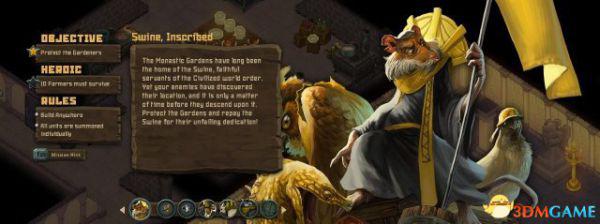 技巧:这个关卡的主要任务是保护小猪。小猪会在地图上的固定10个位置刷新,然而,并不是说小猪的上限是10只。只要你保护它们不被干掉,他们会一直刷出来。但是一只小猪的刷新至少需要20秒。所以一定要记得游戏规则,必须至少1只小猪活着才可以继续游戏。该关卡的技巧在于使用羽毛线圈。每个小猪开垦的地方都会很窄的入口,在那附近布置羽毛线圈可以很好的牵制近战敌人。另外,玩家需要时刻观察小地图敌人孵化地的动向,一旦有敌人开始在某个区域孵化士兵,就应该迅速前往消灭他们。由于地图充满了沟壑,所以走起来比较令人无语,很容易就碰到死胡同。这个关卡的难度还是比较大的。取得英雄主义至少需要10个小猪存活,条件非常苛刻。