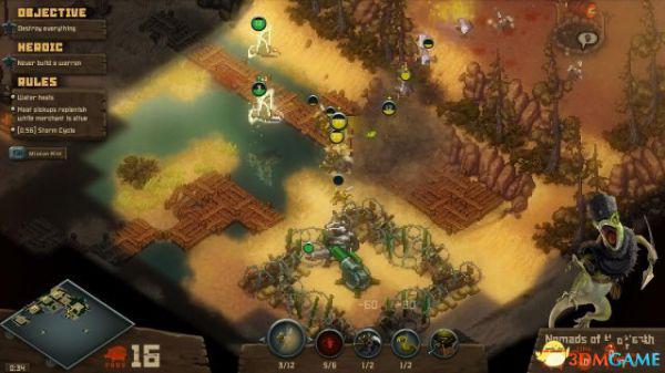 规则:在水中可以获得治疗;食物多余200会迅速腐烂;热沙天气使得任何单位离开己方的风车农田范围,都会使生命值降低。