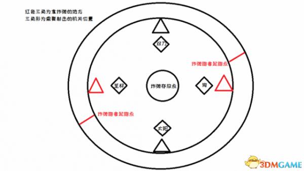 站台者必须根据跑者位置来站圆台,以此来激活面前三角形灯里面3*3的9个圆环。跑者看9个圆环中哪一环亮了,就报相应的“行”,站台者和游走者就打另外2行的三角形灯,请务必2人同时打,可以多开几枪确保同步。(比如上面一行中间一环亮了,那么跑者就报“上面”。站台者和游走者,就一起打另外2个三角形灯,一个打中间一个打下面。打到2个灯一起亮白光即可。不打上面那个三角形灯。)