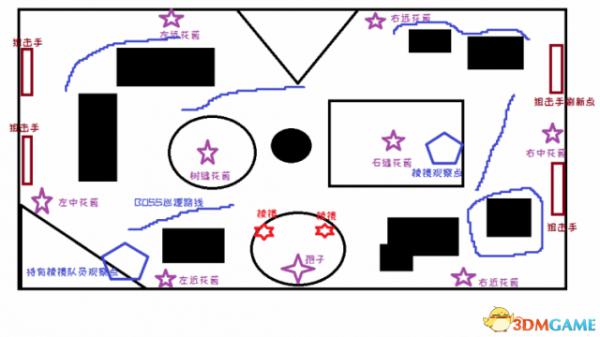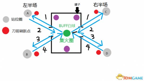 战斗开始后,中间点的人,立刻延1号线,跑到A点。