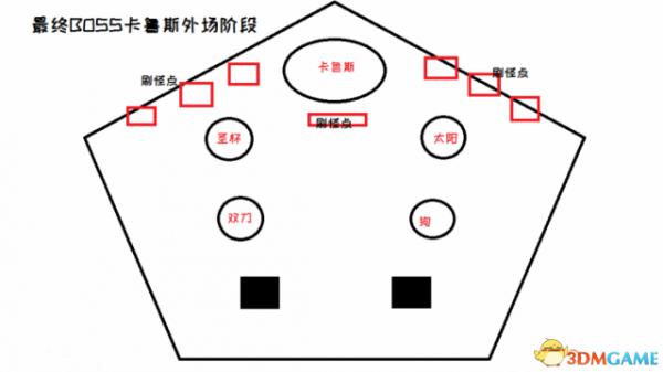打死后,两人立刻换位,来的人站住A点白圈。A点的人延2号线进入中间房间,吃BUFF白球,房间里的小怪不要管,丢手雷or近战顺手打一下,不要停留,确认吃了BUFF立刻延3号线进入B点。这时候B点应该正好刷刀哥,一样两人一起打掉。然后换位,B点的人延4号线去吃BUFF,然后延1号线进入A点,以此循环。大概1次循环之后,所有点位的面前的铁链会锁住,场景BGM也会有明显变化,罐子都被拉出来了,这时候所有人进入中间房间,集中站位集火罐子。