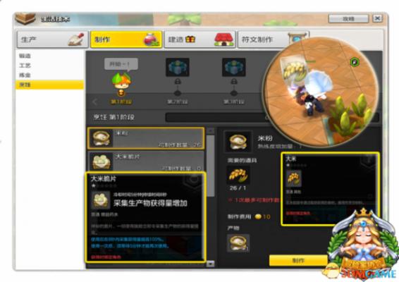 根据所种植田地类型的不同,每种作物都拥有自己的专属产物,比如水稻田可以收获大米,南瓜地可以收获南瓜。这些收获的田地产物是必要的烹饪材料,用于制作各种可以赋予角色增益状态的美食佳肴。打开【生活技术】界面,选择“制作”,即可在烹饪标签页中查看所有料理、所需食材,和最终烹饪出的料理效用。比如最初级的水稻田,产出的大米可以用于磨制米粉,米粉则用来烹制大米脆片、松茸火锅、香蕉三明治等料理,其中大米脆片在食用后,可以使角色在8秒内采集获得量提高100%,合理利用将大大提高采集效率。后期的高级料理甚至有恢复生命值、提高经验获取、与队友分享共同增进攻击力等诸多妙用!