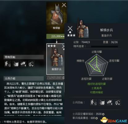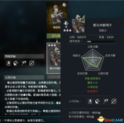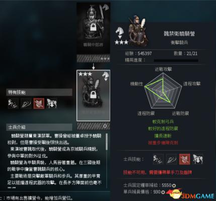 第三是十级的禁卫骁骑,个人认为整体效果不如魏豹骑的强势,禁卫骁骑是重骑冲锋,不是跟随冲撞,而且没有大斧的技能,兵力也只有21个,单兵补兵价格930铜币,一场下来整体补兵费用+粮草补给要25000铜币,如果战场失利的话,可能会亏本。如果你有一定条件,可以为了赤长坡和大宛骏马解锁禁卫骁骑,虽然强势,但不如魏豹骑的均衡。
