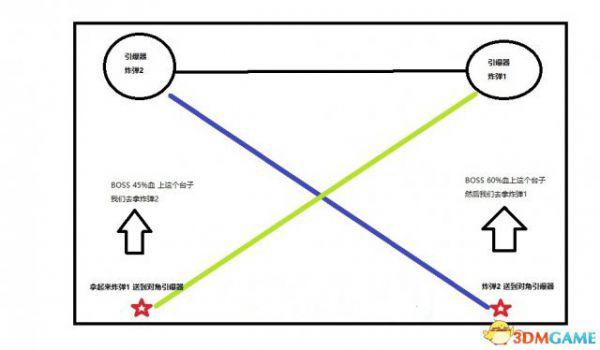 BOSS 45%血左右会上右边边的大柱子上,然后开个无敌罩子,同时左边的场地会出现送炸弹的白色飞机,等飞机起飞后,拿起炸弹送到右边的引爆器中。