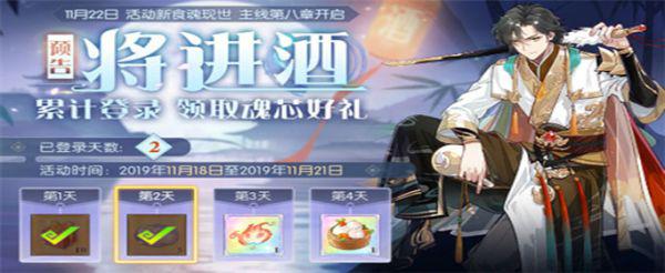 通过这个累计登录活动能够免费领取一枚魂芯,由于这枚魂芯来自太白鸭的活动,一发入魂的概率还是非常高的。各位少主可以在11月22日当天,在将进酒卡池中召唤(川)系食魂,运气好酒能够免费获得太白鸭。