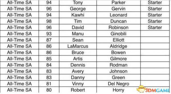 NBA2K游戏将会在今年推出队史最佳模式,这是马刺队队史最佳阵容的花名册以及排名,但是阿尔德里奇和罗德曼?