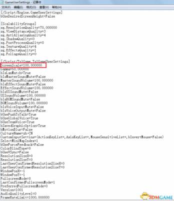 打开GameUserSettings文件夹。找到这一项 ScreenScale如下图。