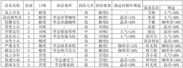 并且2星和3星的顾客会有两条额外的属性,一条是满足时给予的xx(咖啡币/人气/晶币)+(15/30)%,一条是当前咖啡馆有某位特定店员是给予的xx(咖啡币/人气/晶币)+30%。具体如下表: