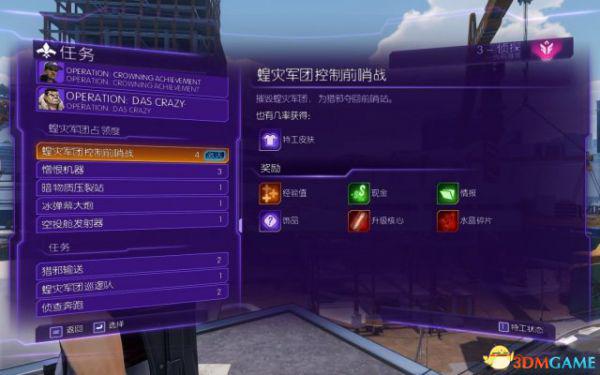 摧毁蝗灾军团,夺回前哨战,到达地点后先尽量破坏蝗灾军团的设备,破坏完后消灭敌人,黑进天线,控制住这个前哨战。有机率获得特工皮肤,且可以显示出这片区域的更多蝗灾军团的支线任务。