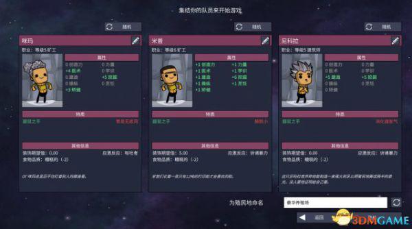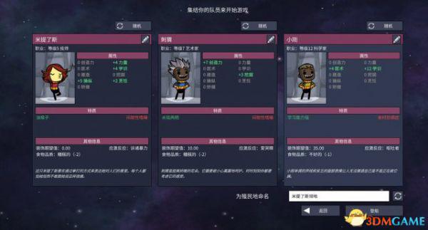 选人结束,没有刻意挑高挖掘和高烹饪,因为我特别喜欢1号角色然后每次都会给她起这个名字,看着属性还可以就留了。正常选人的话一般要有创造力高于5,学识高于8,挖掘高于6,烹饪高于3,这样科技开局会很舒服。至于特质和其他信息没特别选,玩的多控好压力后避开特别提的负面特质后都可以不怎么考虑,毕竟“属性第一”。