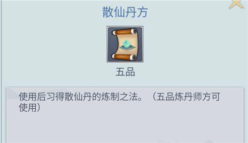 当各位的丹道修为达到五品之后,便可自行炼制散仙丹,各位可以在(坊市)-(珍宝阁)三层中花费10万灵石入手散仙丹方,至于炼制所需的材料和宗门兑换的类型如出一辙。
