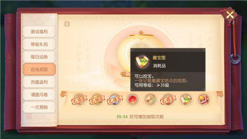2、在线签到奖励:在每日的福利中有一个叫做在线奖励的玩法,玩家们在这游戏中在线一段时间,就可以在这个在线奖励中获取一个抽奖的次数,在这个抽奖的奖池中就有着一个藏宝图的任务奖励;