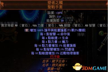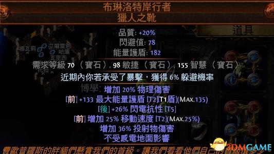 6,靴子 布琳洛特岸行者(此靴子就相当于是为此BD量身打造的,物理伤害,投射物伤害,护盾,移动速度都非常好,关键是价值比一般的术士靴子要便宜很多,台服目前一般ROLL的30C以内,满ROLL能到200护盾左右)