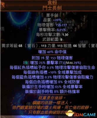 3,武器 食牙(3绿孔,尽量满ROLL,这个需要淘,优先暴击率,物理伤害,最后是主手全域暴击率,台服此武器几乎没人用,价值忽略)