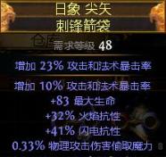 我们需要暴击率,目前没看出到底多少暴击到顶。但是为了达到刀刀暴击的程度。所以我还是选择刺峰箭袋。高血、高抗,“+1箭矢”很难出来。