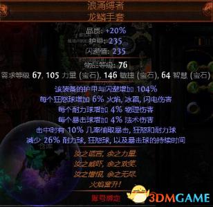 手套便宜,每个狂怒球增加6%的火焰、冰霜、闪电伤害 6*6=36%全属伤害。每个耐力球增加4%的物理伤害 4*6=24%物理伤害。击中时有10%几率偷取暴击、狂怒、耐力球。这个偷字太蛋疼了,因为几率很低。不如暴击10%的球来的实在。