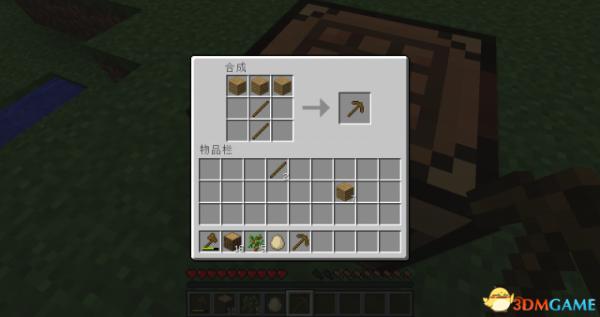 砍到足够多的木头时,照着这个合成配方合成一个木镐,它可以用来采集石头。