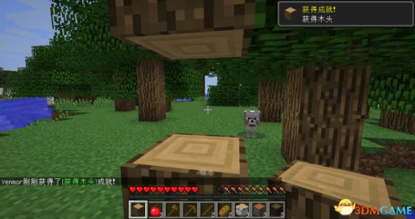 在你的周围会生成一些树,长按左键破坏一个木头,这时你会发现你的物品栏中多出了一个木头(手残拿了奖励箱里的东西)