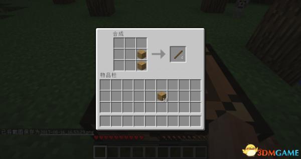 砍树太慢?不用着急,先把木板像这样摆(先左击木版,然后长按右键划过这两个地方,就可以这么摆出来)合成出木棍。