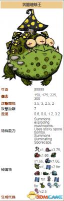 这些香菇树会帮蟾蜍王补血,根据香菇树的数量,会让蟾蜍王的攻击速度、伤害、攻击时间、伤害吸收(护甲)、命中恢复("命中玩家"动画之间的秒数)发生改变,并且放出的香菇炸弹数量也会增加。