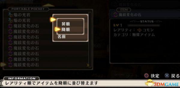 接下来利用魔纹变化珠BUG来强化メタリカの剣。首先把メタリカの剣卸下来,去炼金屋。第一步进錬成アイテム选メタリカの剣,第二步先进触媒界面,随便选个排序(这步很重要)然后选择魔紋変化の石。