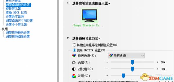 在显示里,,点击调整桌面颜色设置 ,点选使用NVIDIA设置,将灰度调高就可以了