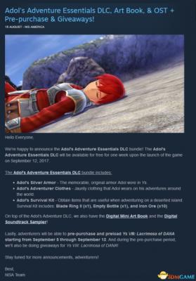 在游戏正式发售后一周之内(9月19日之前)购买游戏的玩家会得到免费的DLC,包括亚特鲁的银护甲,冒险者服饰和生存工具包,以及游戏的OST和漫画,非常有收藏价值。